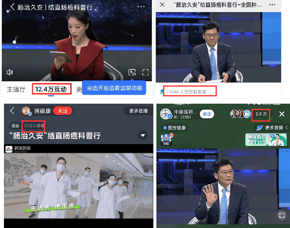 截至2022年4月21日晚,“腸治久安”415全國腫瘤防治宣傳周在人民日報健康客戶端、光明日報、南方日報等平臺刊發(fā)稿件約50篇次,科普直播7場,包括騰訊新聞、知乎、民福康新浪平臺、名醫(yī)在線各媒體號及各大合作商的直播平臺近20家,累計觀看量近252萬人次。