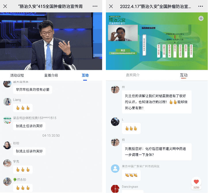 本次全國腫瘤防治宣傳周吸引了結直腸領域超38名各級專家大咖積極參與。其中,由中國醫(yī)師協(xié)會主辦,康立明生物協(xié)辦的“腸治久安”415全國腫瘤防治宣傳周活動共舉辦線上直播7場,邀請中國醫(yī)學科學院腫瘤醫(yī)院王錫山教授、張凱教授,首都醫(yī)科大學附屬北京友誼醫(yī)院冀明教授等共9位專家大咖參與現(xiàn)場訪談與科普;聯(lián)合5位結直腸領域?qū)<覅⑴c“腸治久安”宣傳周專家視頻錄制?!耙癖pB(yǎng)愛車一樣愛惜自己的身體”、“發(fā)現(xiàn)癌癥不光榮,發(fā)現(xiàn)早期癌癥才光榮”等金句也隨著科普直播的擴散為大眾所熟知。