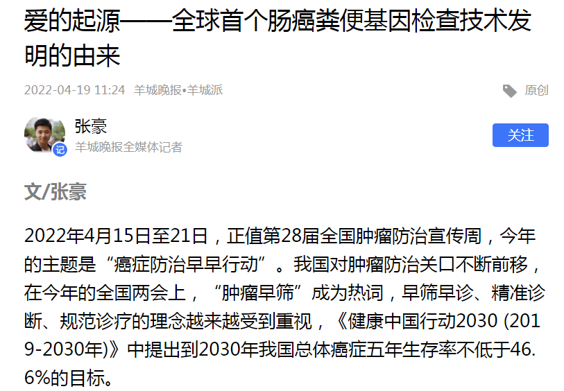 全國腫瘤防治宣傳周期間羊城晚報客戶端汪建平教授專家訪談、“愛的起源”腸癌早篩技術發(fā)明由來等媒體報道,更是聚焦醫(yī)學人文領域,通過表現(xiàn)科研人員在攻克結直腸癌防治難題的歷程,側(cè)面?zhèn)鞑ソY直腸癌早篩知識,讓人們認識到新型腸癌早篩技術研發(fā)的不易,進一步提升民眾的自身腸癌防治科學素養(yǎng)。