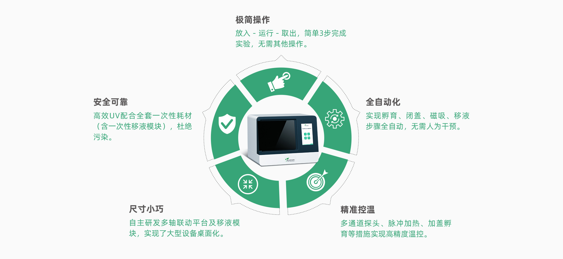 全自動核酸提取儀H24采用了自主研發(fā)的移液模塊、孵育模塊,通過磁珠法全自動實現(xiàn)大體積復(fù)雜樣本基因組DNA的提取、富集、轉(zhuǎn)化、純化過程,解決了復(fù)雜樣本高質(zhì)量核酸自動化提取轉(zhuǎn)化難題。設(shè)備采用多軸聯(lián)動的自動化平臺,配合獨創(chuàng)的移液模塊,極大地縮小了移液平臺尺寸,同時提高了設(shè)備運轉(zhuǎn)效率。